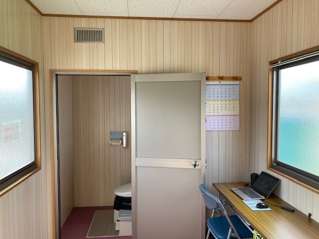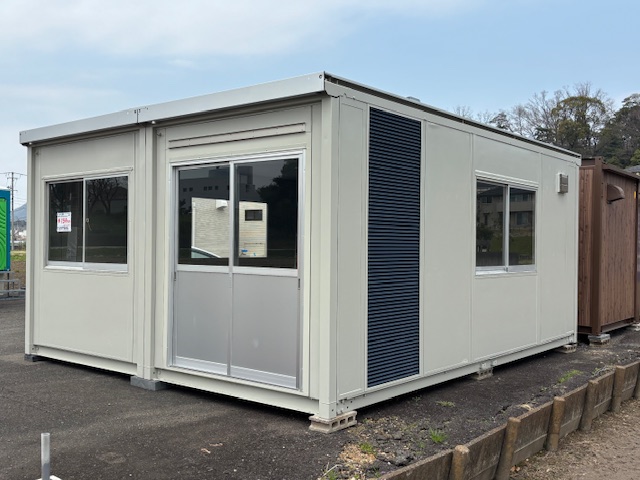 仕様 | 電気があれば、設備費不要です。午後から水洗式トイレ・エアコンも使用が出来ます。少人数事務所・現地での商談室などに最適・移動も簡単に出来ます。