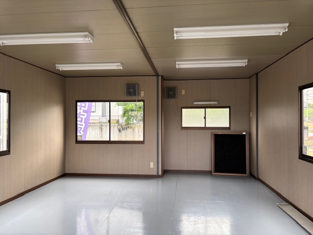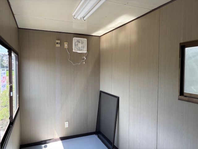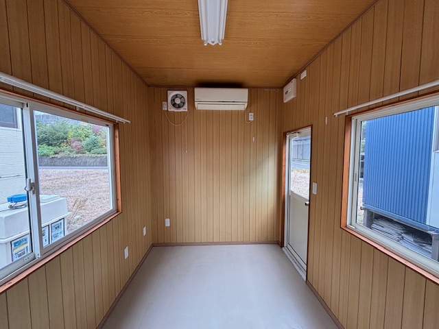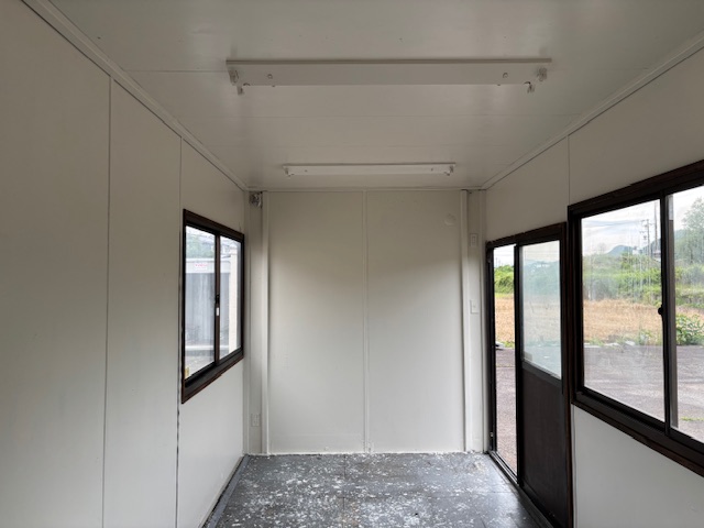 仕様 | 出入口引き違い戸1箇所・窓4箇所・換気扇2箇所・キッチンスペース付小窓 8坪綺麗なハウス・(事務所・休憩室に最適) |