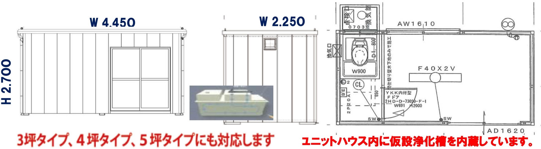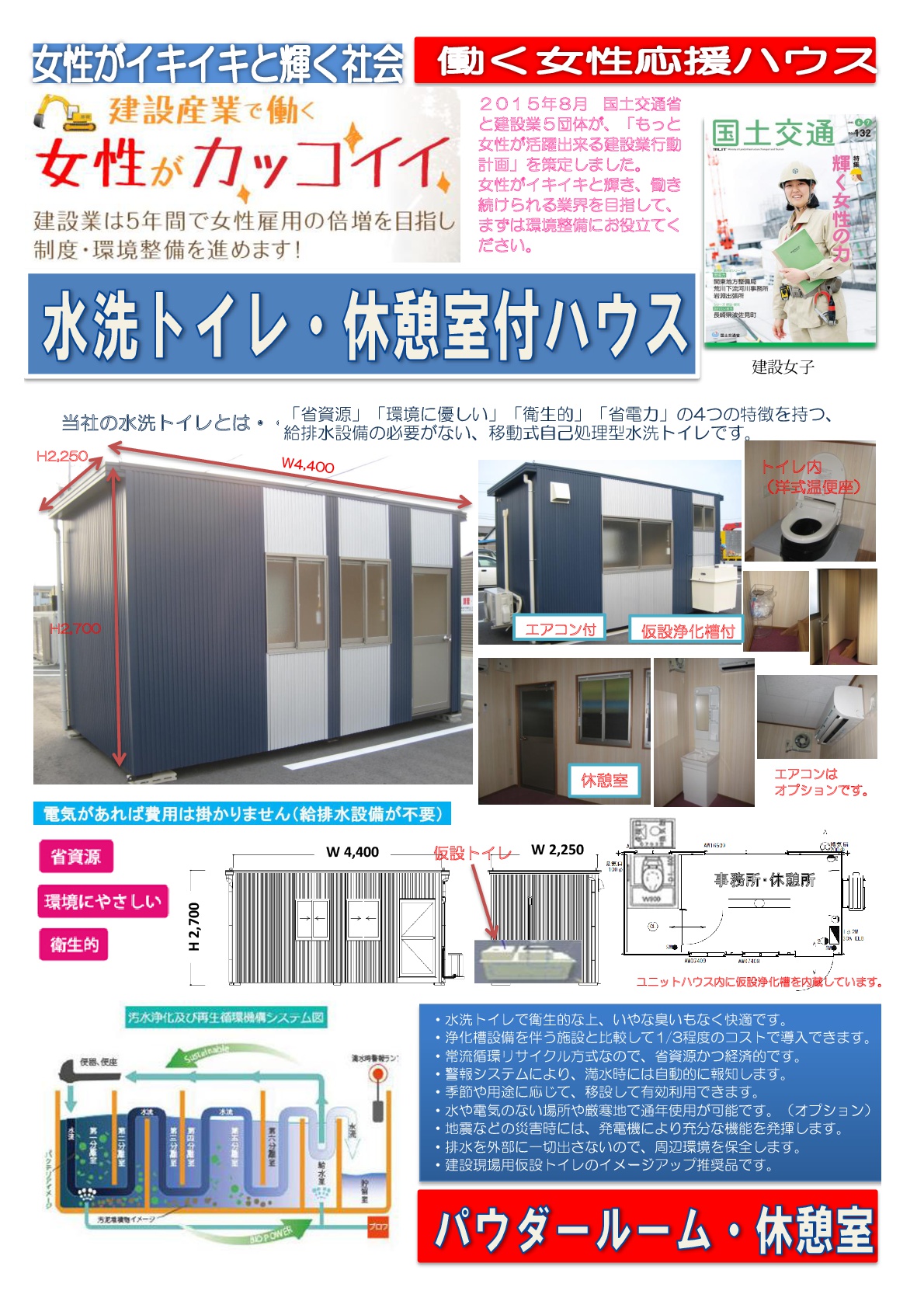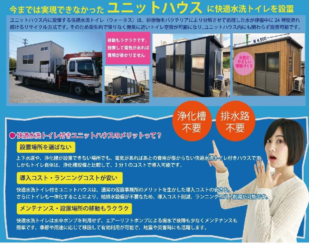 中古やレンタルに ついても対応いたします。また、ユニットハウスと常流循環リサイクル方式トイレ「ウォータス」との組み合わせもご提案できますので、お気軽にお問い合わせください。