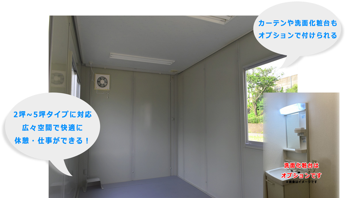 ●採掘現場などでの事務所・休憩所 給排水不要 | ●小規模な販売店(車・路面店舗) 移動可 |